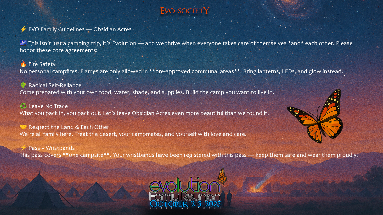 This is not a traditional festival β€” it’s a radical self-reliant campout for friends and family of past EVO events. We’ve reserved the first 50 spaces at Obsidian Acres, and each pass covers one campsite with wristbands for your crew.